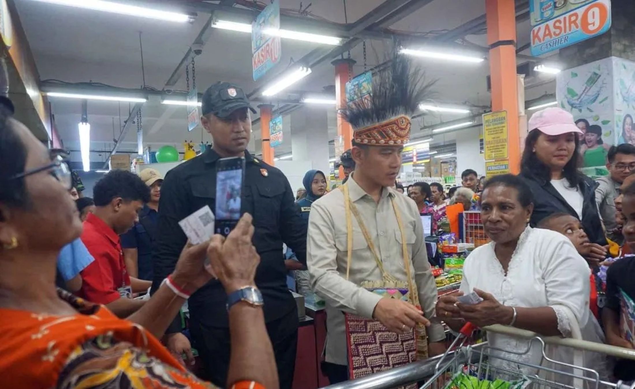 Wakil Presiden Gibran Rakabuming Raka (tengah) memberikan bantuan kepada warga di Kota Sorong, Papua Barat Daya, Selasa (21/4/2026). (Antara)